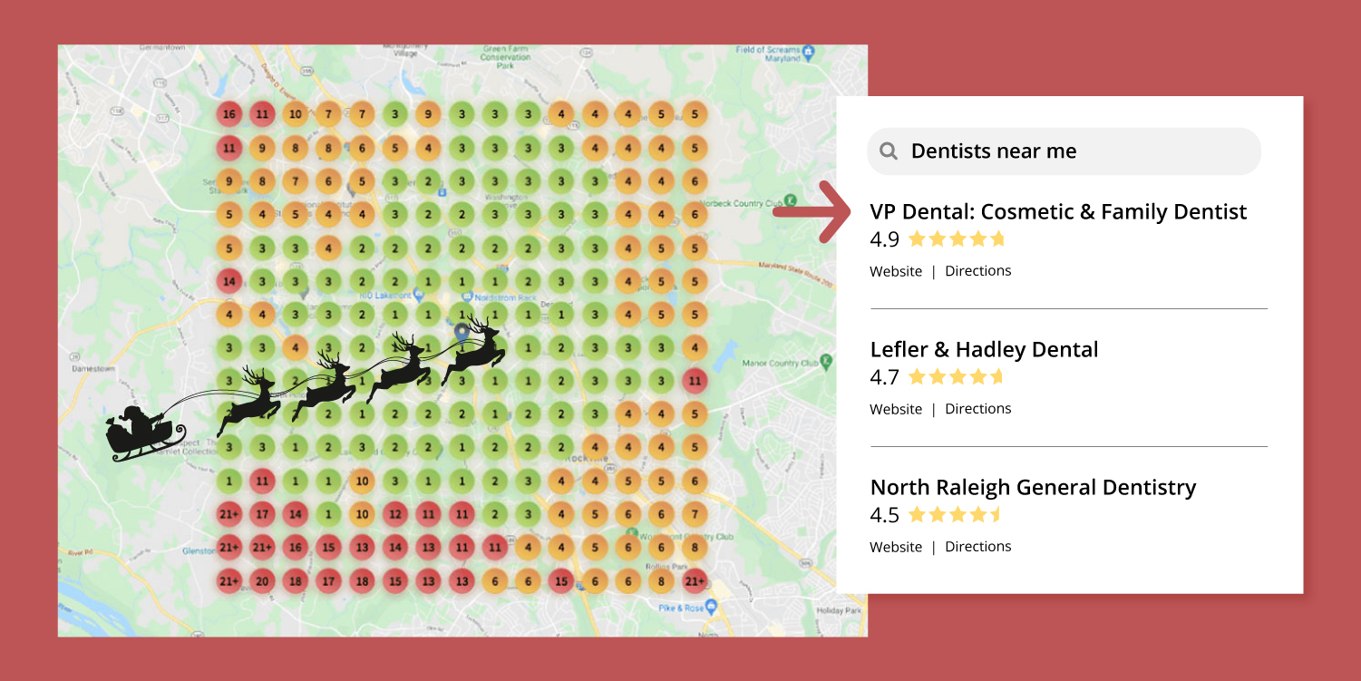If Santa searched from a green circle in your area, he likely found your practice! Searches from the orange or red circles mean you ranked lower for the search "dentists near me" from that area.