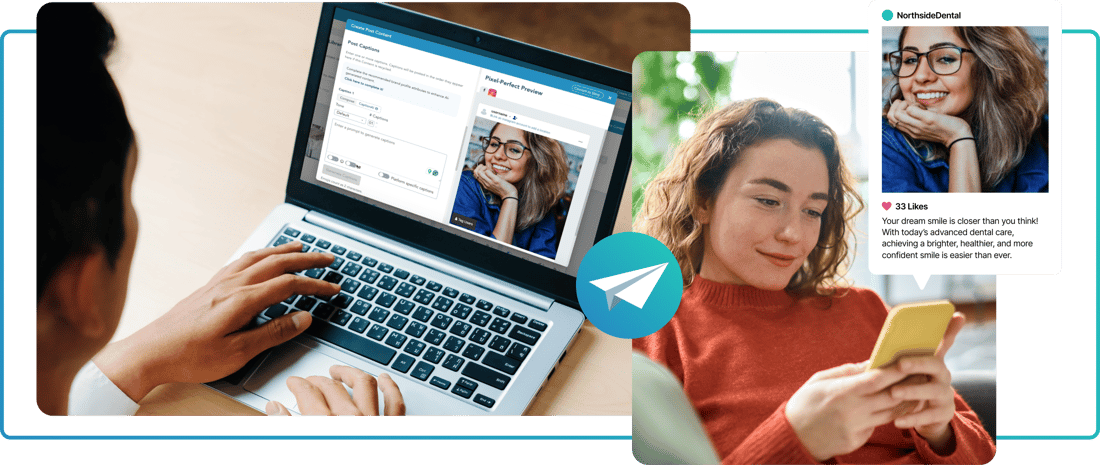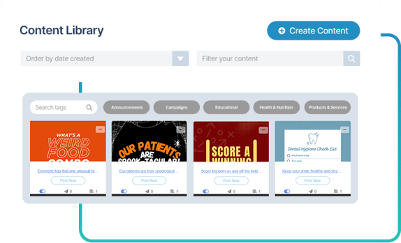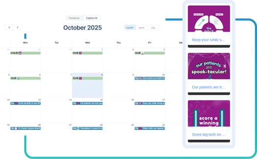 Create, customize, and schedule dental-specific social content all in one place, plus manage comments and direct messages in-platform. No stress. No guesswork. Just streamlined, pro-level posting in one intuitive dashboard built just for dental practices.
