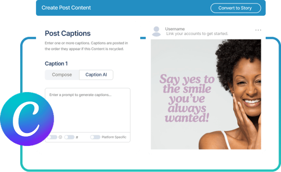 Design posts with your own photos, use our built-in stock images from Pexels, or create with our popular Canva integration. Add captions with AI assistance (or go full Shakespeare on your own).